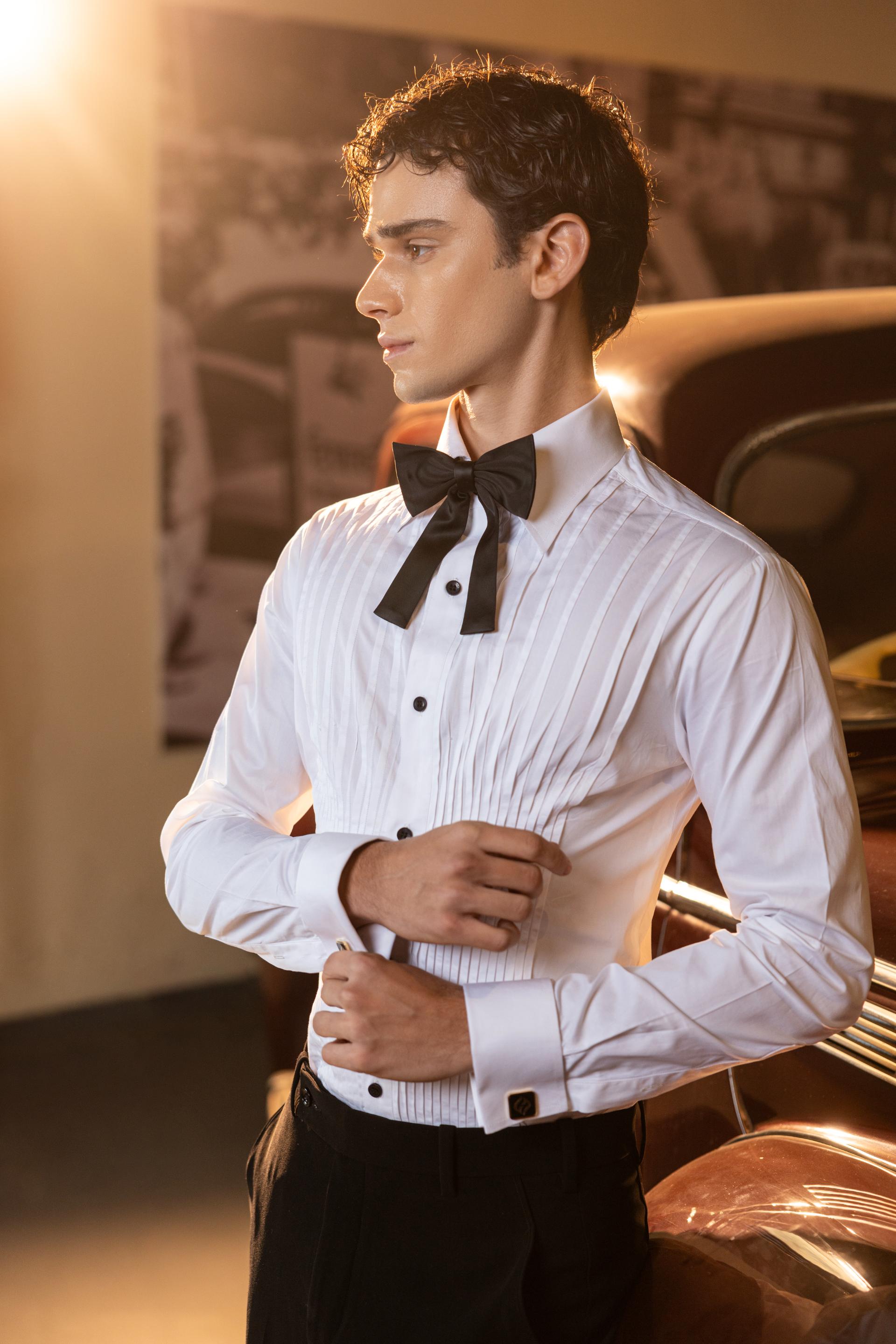 Design Elements :- Features a sophisticated classic pin-tucks shirt , with french cuffs and velvet shawl lapel with satin piping.