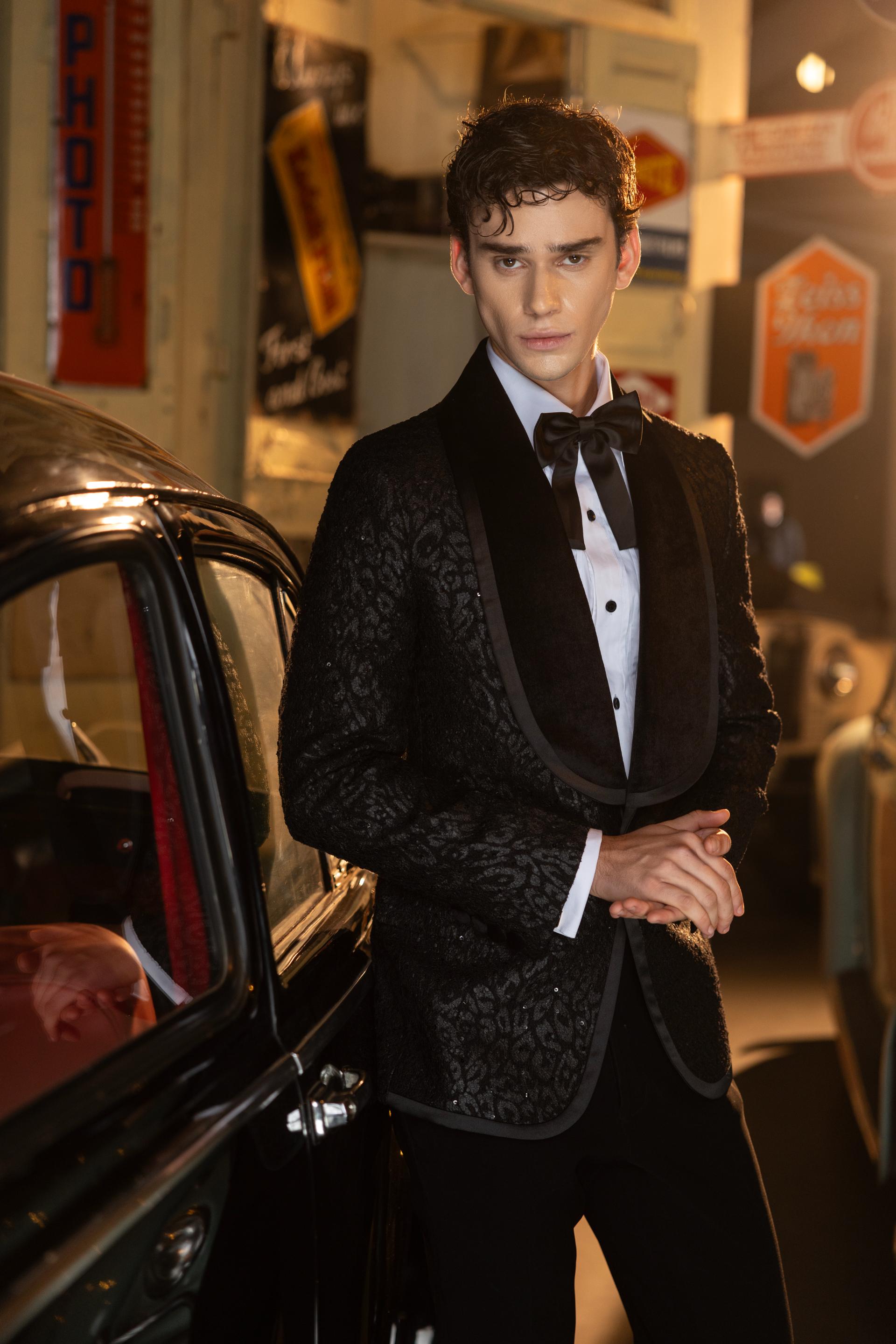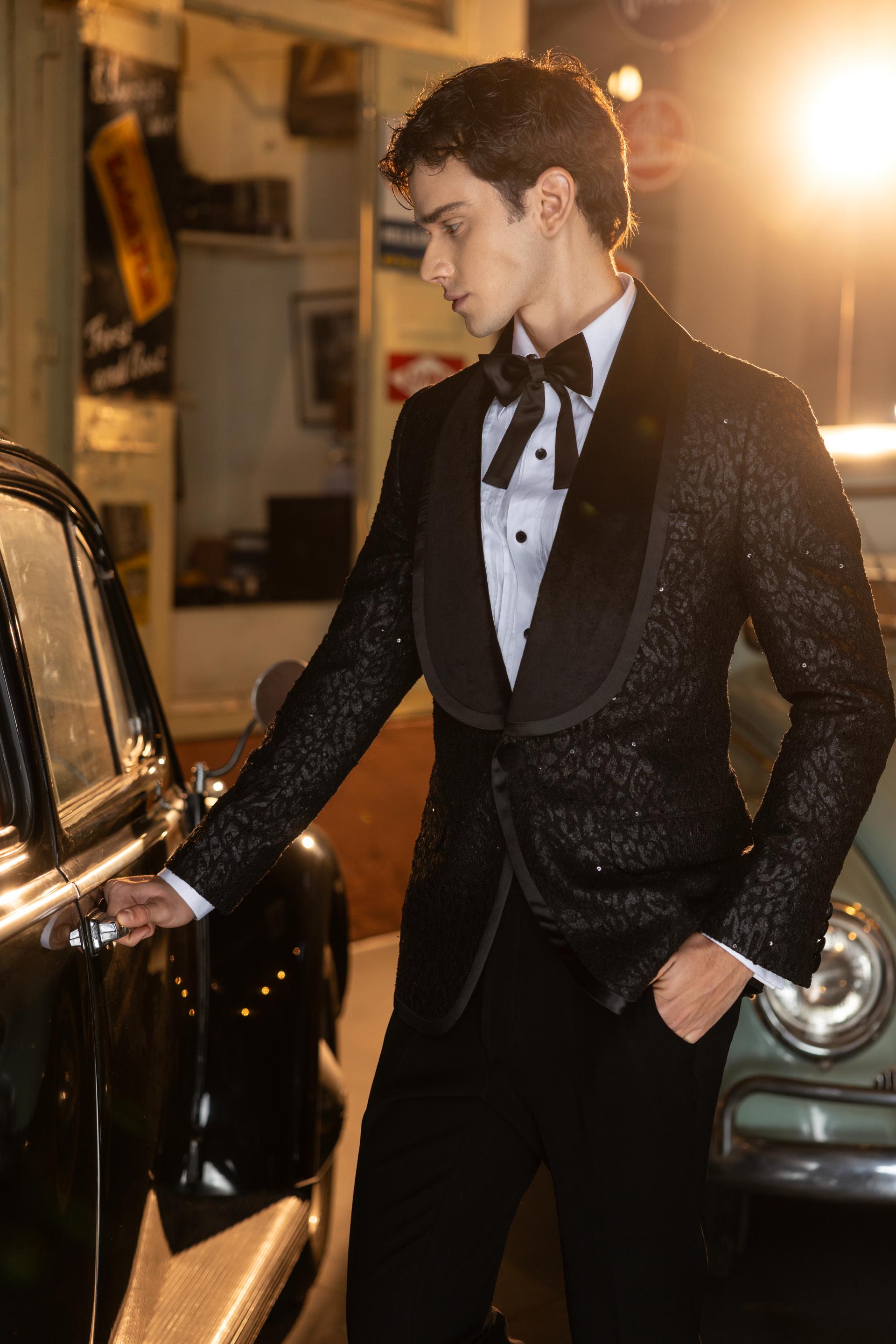Combination :- A luxurious all black textured & set comprising a shawl lapel tuxedo & straight fit trousers, with designer tucks shirt perfect for distinguished for cocktail.