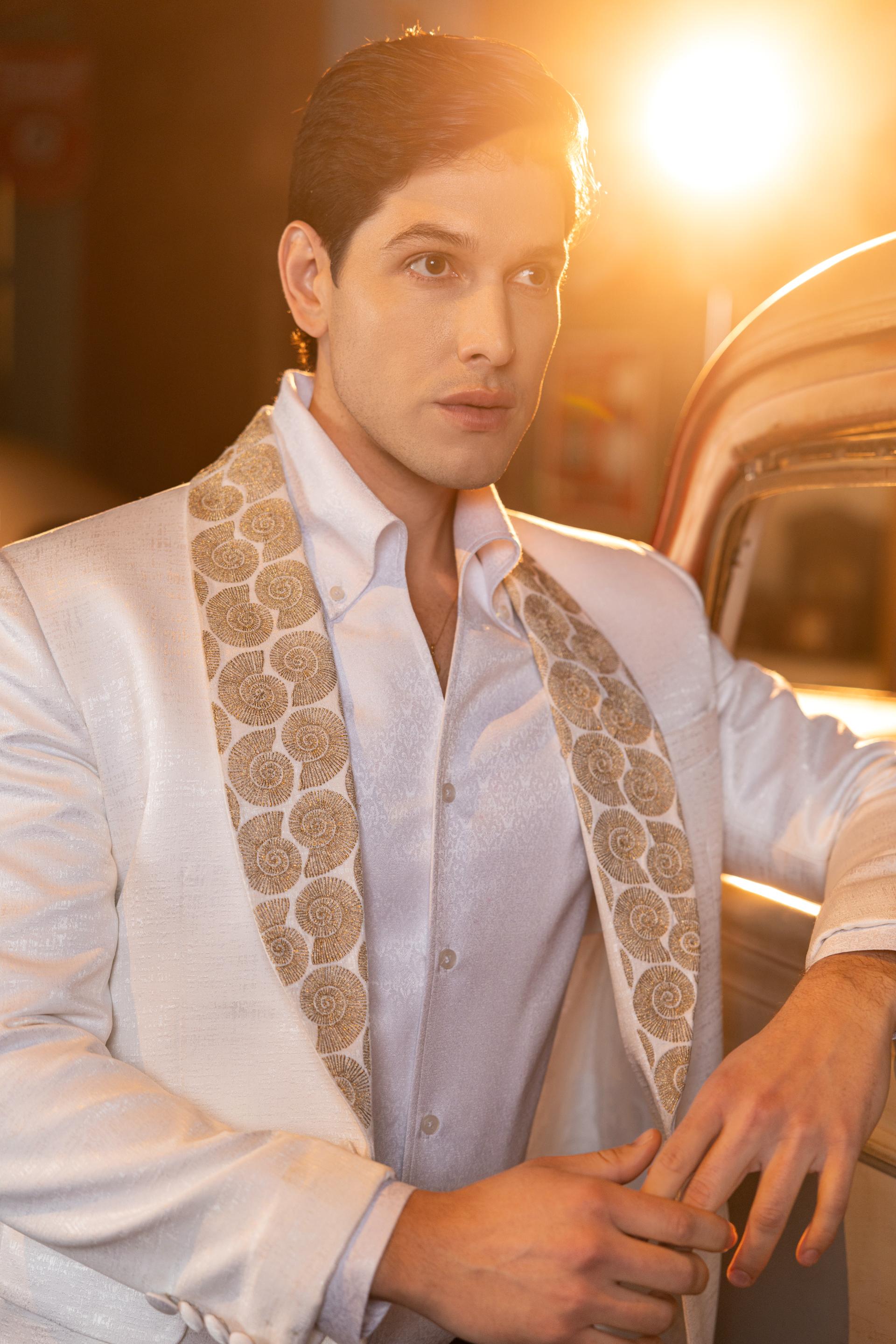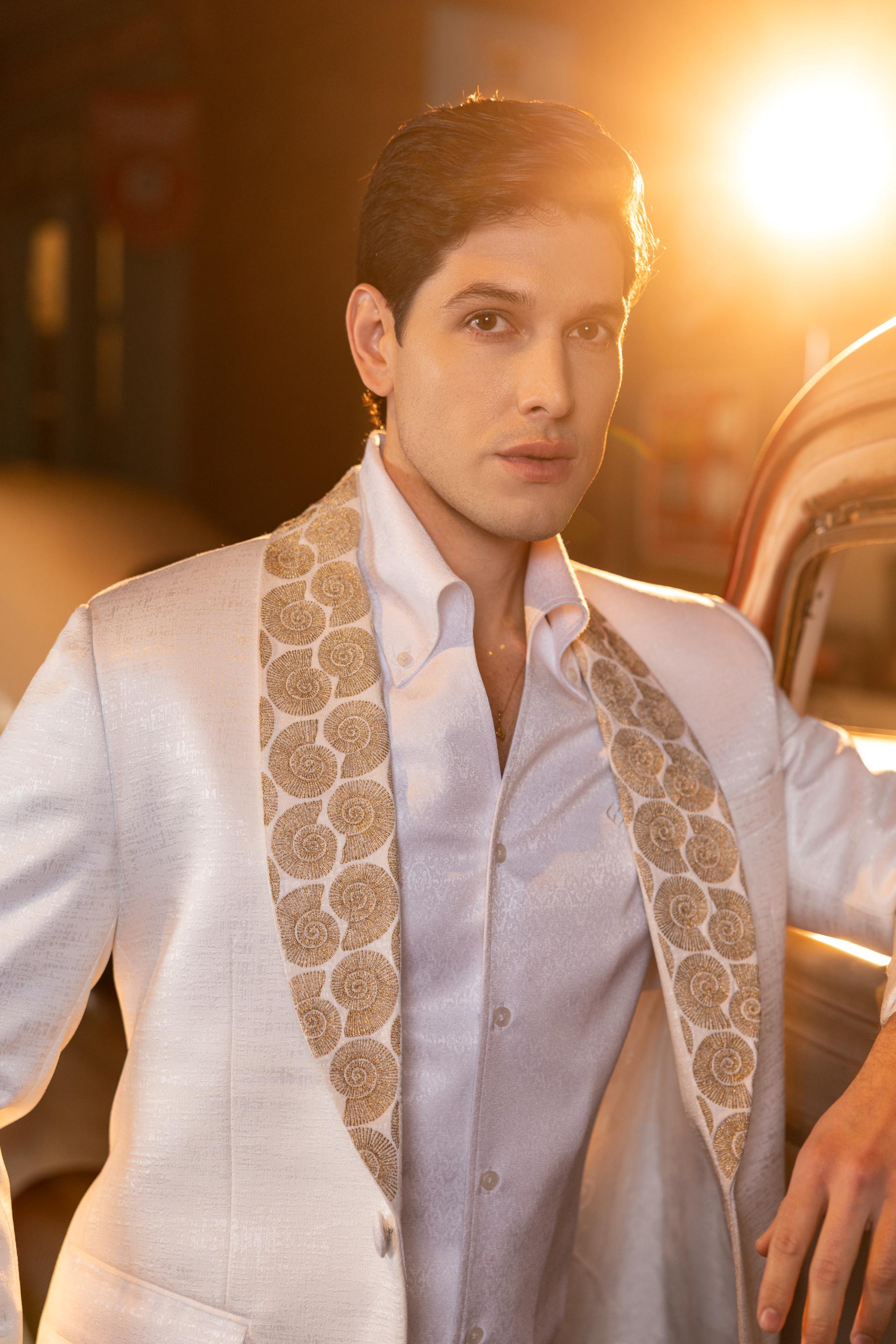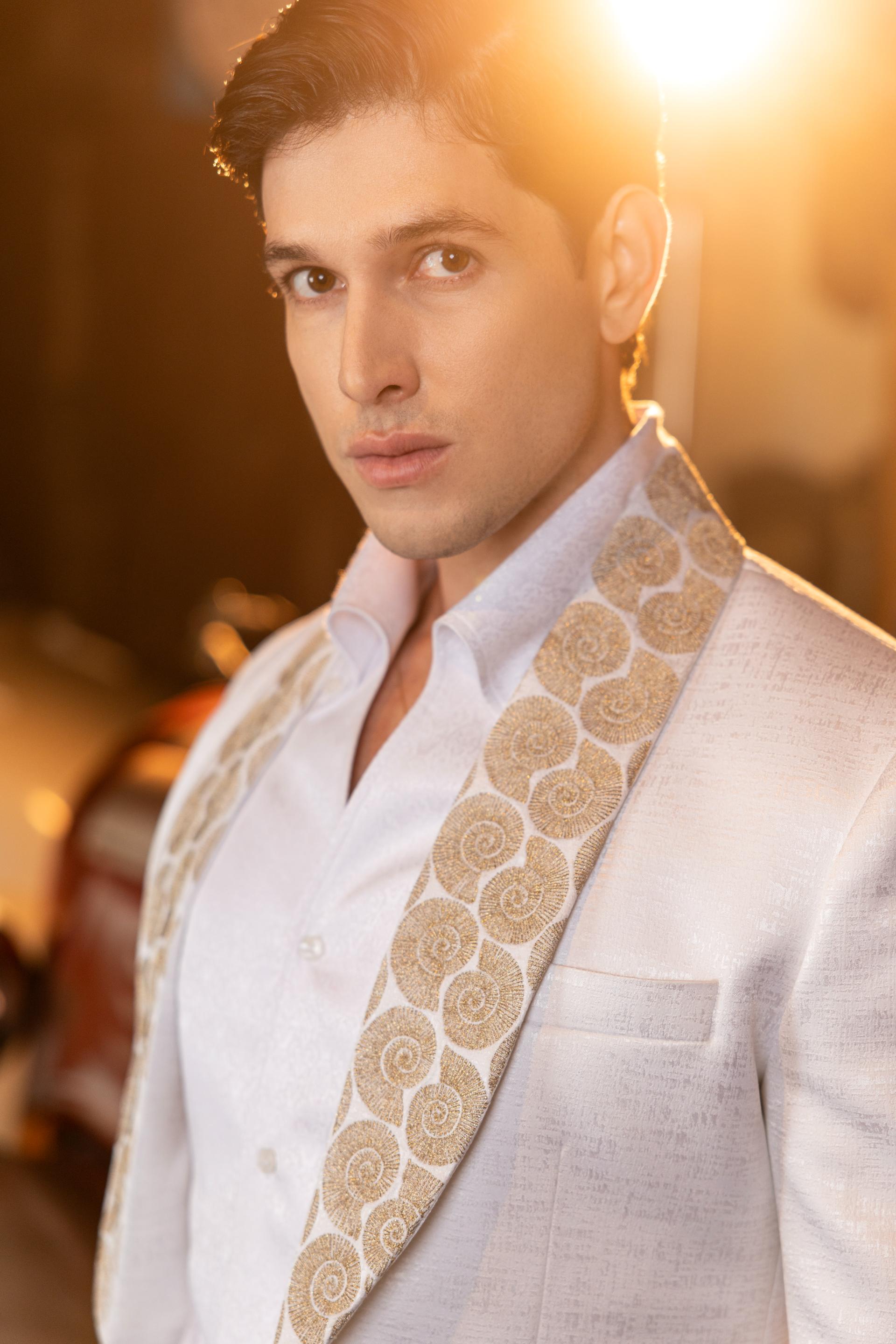 Presenting a striking fusion of contemporary elegance and refined craftsmanship. This off-white tuxedo, crafted from luxurious textured manmade fiber fabric, is paired with black trousers and a pristine white shirt. The shawl collar tuxedo is accentuated by intricate zari-embroidery on the lapel, while the sophisticated copper-collar shirt with front closure buttons enhances the overall look. Full sleeves complete the elegant silhouette, making this ensemble the perfect choice for distinguished occasions, exuding both style and poise.