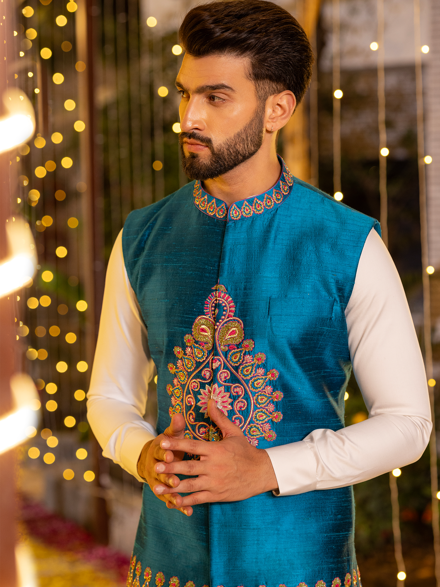 Introducing our designer ensemble in Electric blue hue, meticulously crafted from premium raw silk fabric. Adorned with exquisite hand embroidery and machinery work featuring zari, cut dana, and resham threads, this piece exudes opulence. With a classic ban neck and an open look, it epitomizes refined elegance. Paired with a white kurta Pyjama and designer customized jutti, this ensemble offers timeless sophistication with a modern twist.