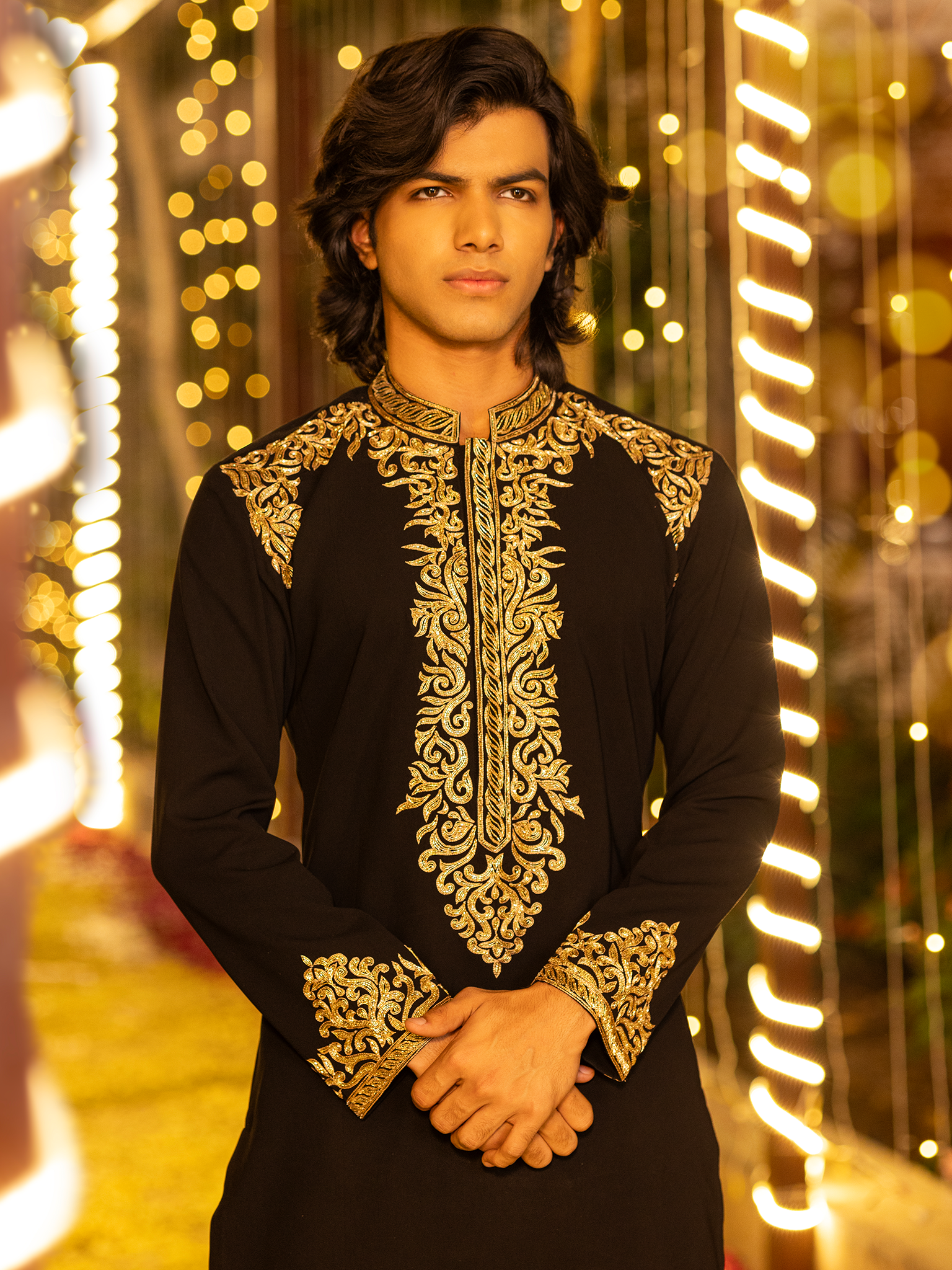 Introducing our exquisite designer kurta and trousers crafted from premium Japanese fabric. Imbued with intricate handwork, and adorned in sleek black, the kurta features a distinguished ban neck and an elegant open placket, perfectly complemented by full sleeves for a refined look. The accompanying bell-bottom trousers add a touch of flair to complete the ensemble.