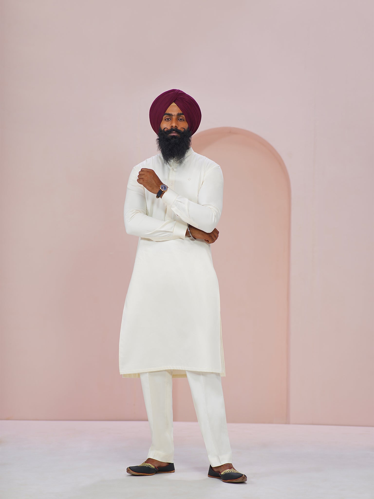 Cream coloured kurta pyjama in Giza Cotton. This Traditional Kurta pyjama Is The Perfect Way To Reflect Your Own Personal Style For Festive Occasions Or Wedding Celebrations. Our Collection Includes A Variety Of Colors, Fabrics, And Designs To Suit Your Individual Style.