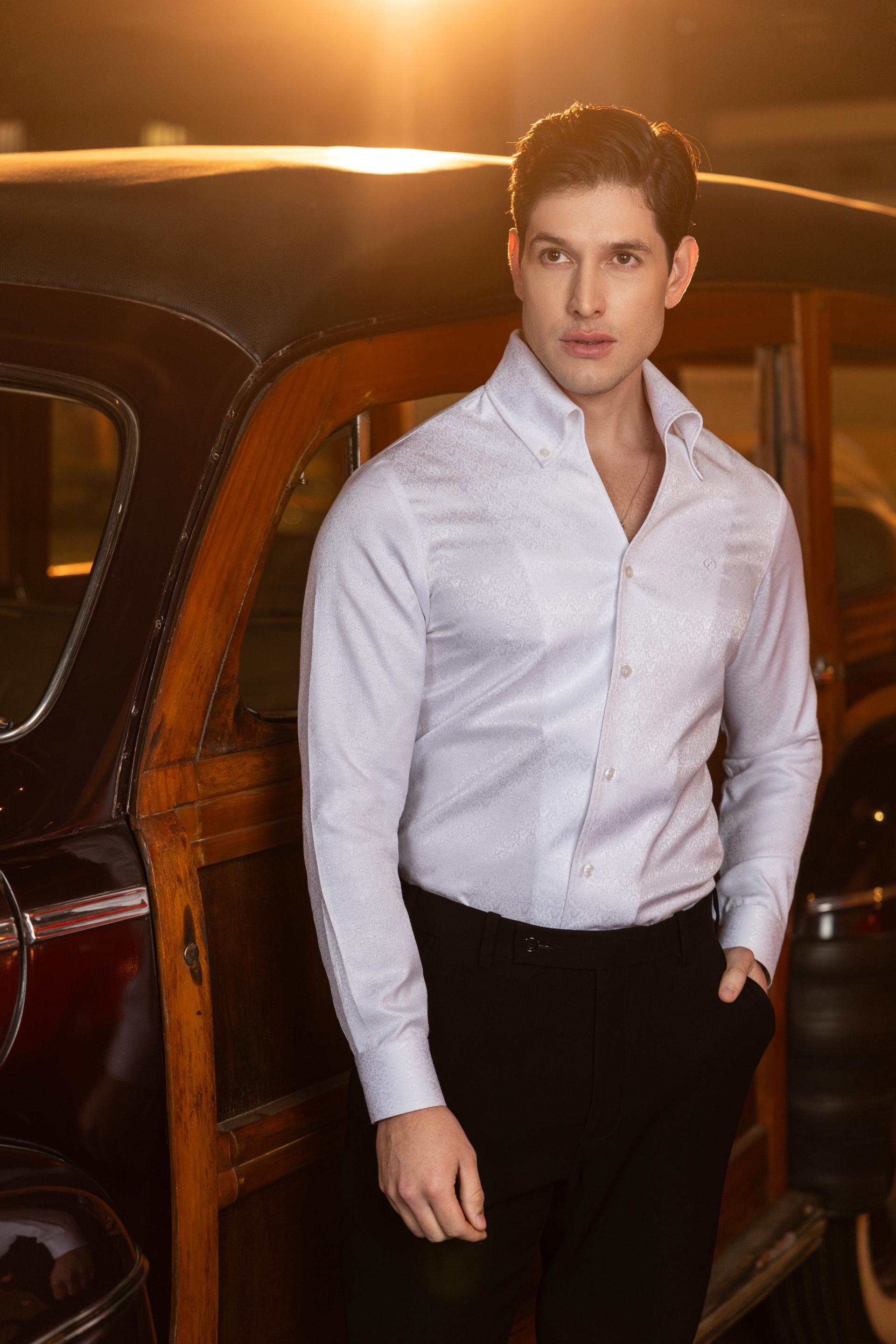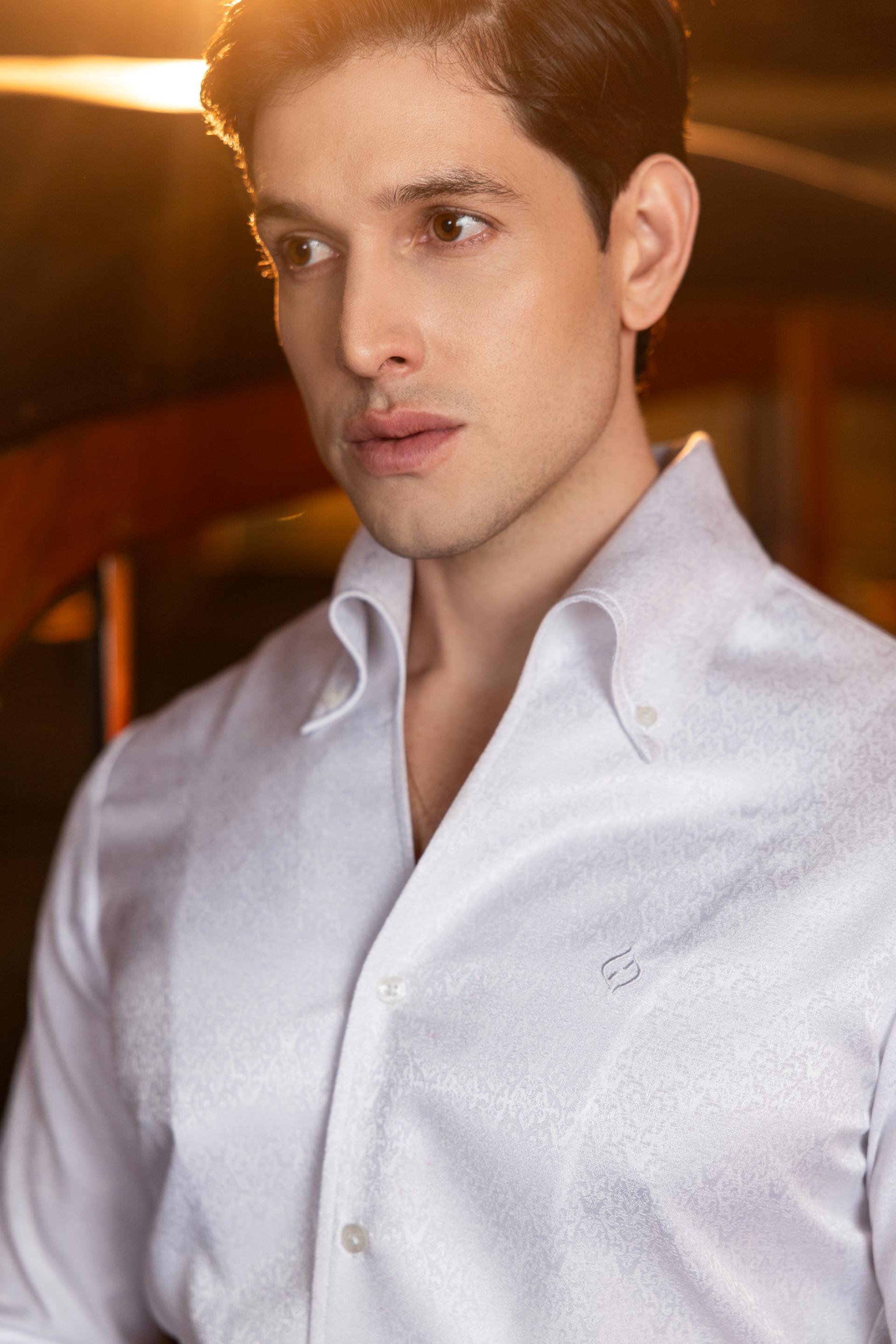 Indulge in sophistication with our designer jacquard shirt, crafted from a luxurious cotton-polyester blend with a subtle sheen. This pristine white masterpiece features a distinctive cooper collar, front button closure, and full sleeves with refined cuffs, offering an elegant silhouette. Perfect for elite gatherings, its unique fabric texture and impeccable craftsmanship ensure a distinguished presence at any formal occasion.