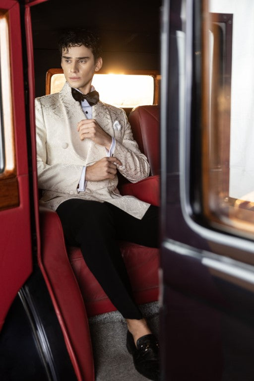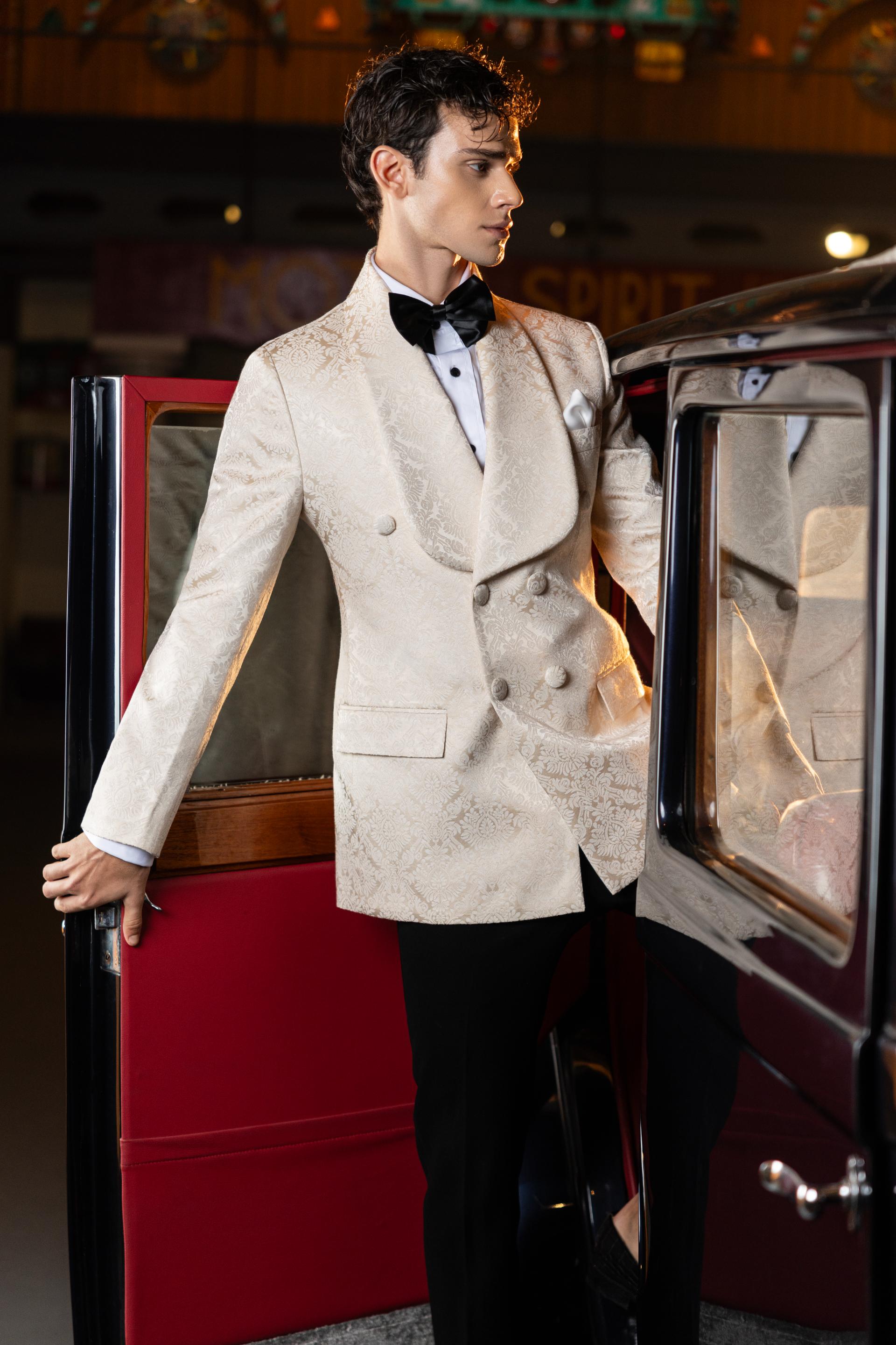 Introducing a masterclass in refined elegance. This distinguished outfit features a cream double-breasted coat, meticulously crafted from luxurious Turkey Jacquard fabric, paired with impeccably tailored black trousers and a crisp white pin-tucks shirt. The coat’s classic pin-tuck detailing and French cuffs, combined with full sleeves adorned with double cuffs, create an effortlessly sophisticated silhouette. Perfect for cocktail affairs, this cream and black set exudes timeless charm and modern refinement.