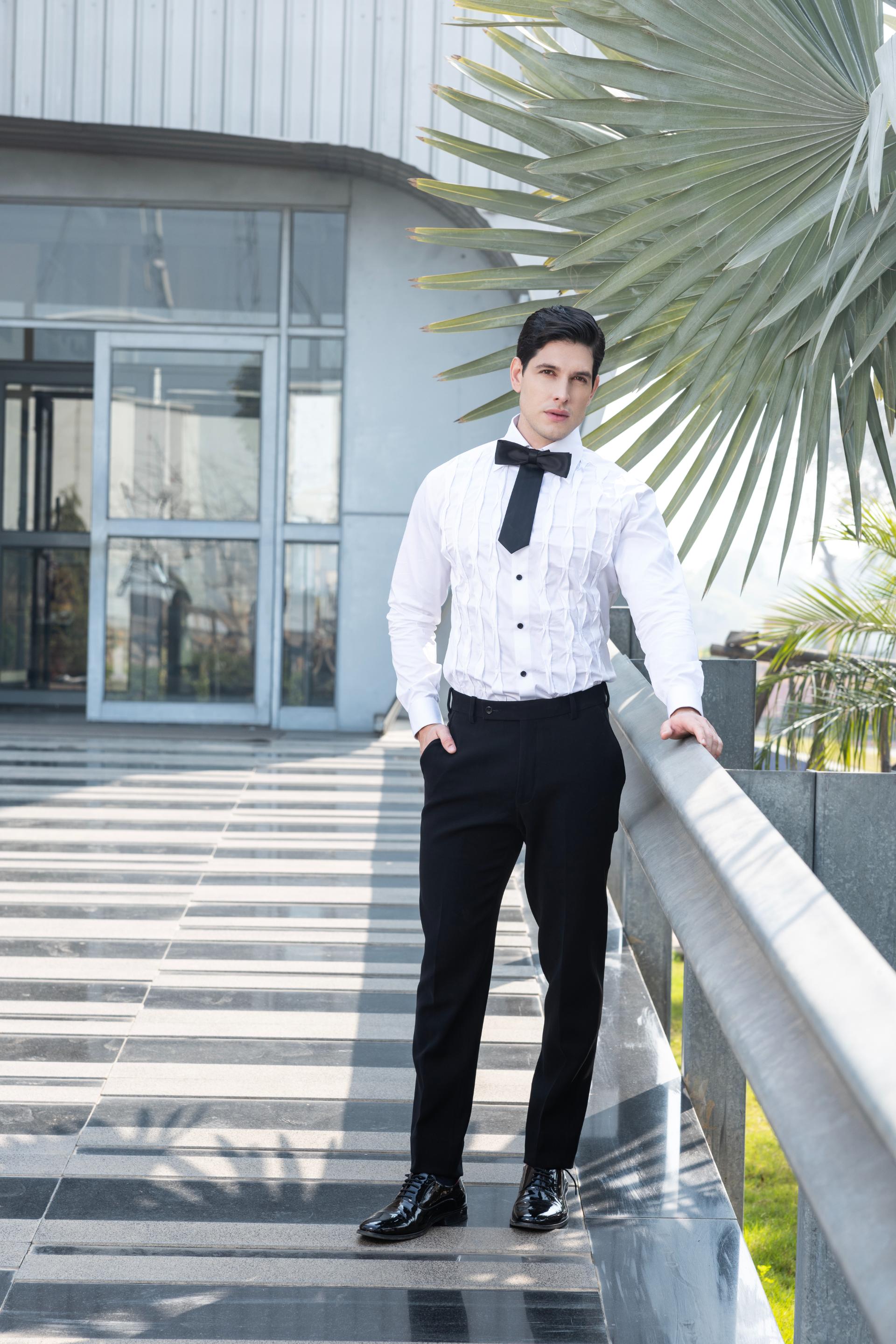 Combination :- A luxurious all black & white set comprising a hand-crafted shawl lapel tuxedo & straight fit trousers, with designer diagonal tucks shirt perfect for distinguished for cocktail.