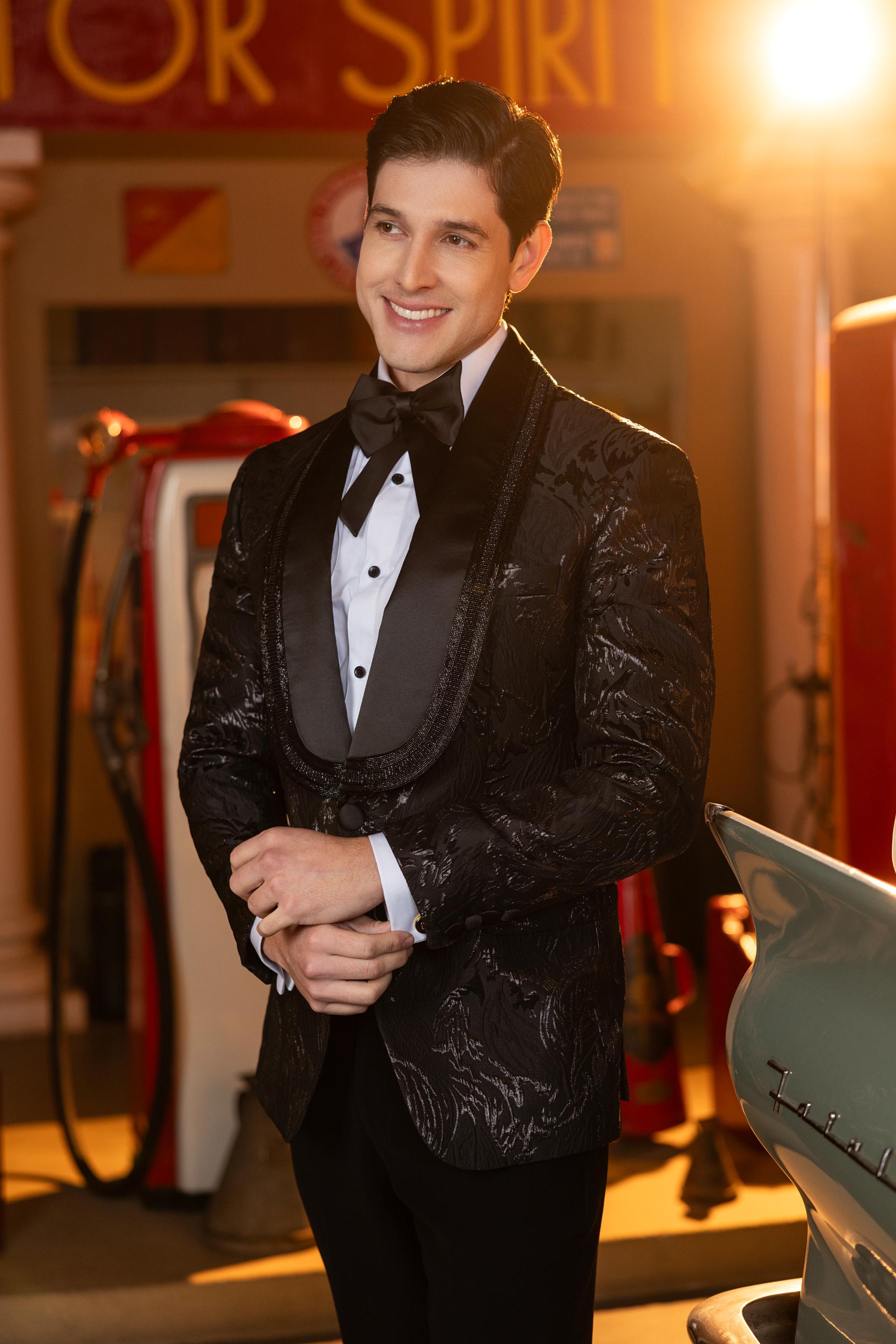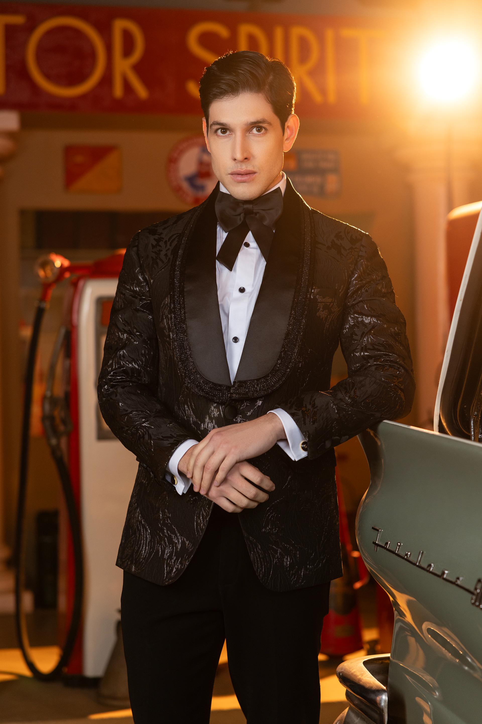 Design Elements :- Features a sophisticated diagonal pin-tucks shirt , with french cuffs and shawl lapel on tuxedo.