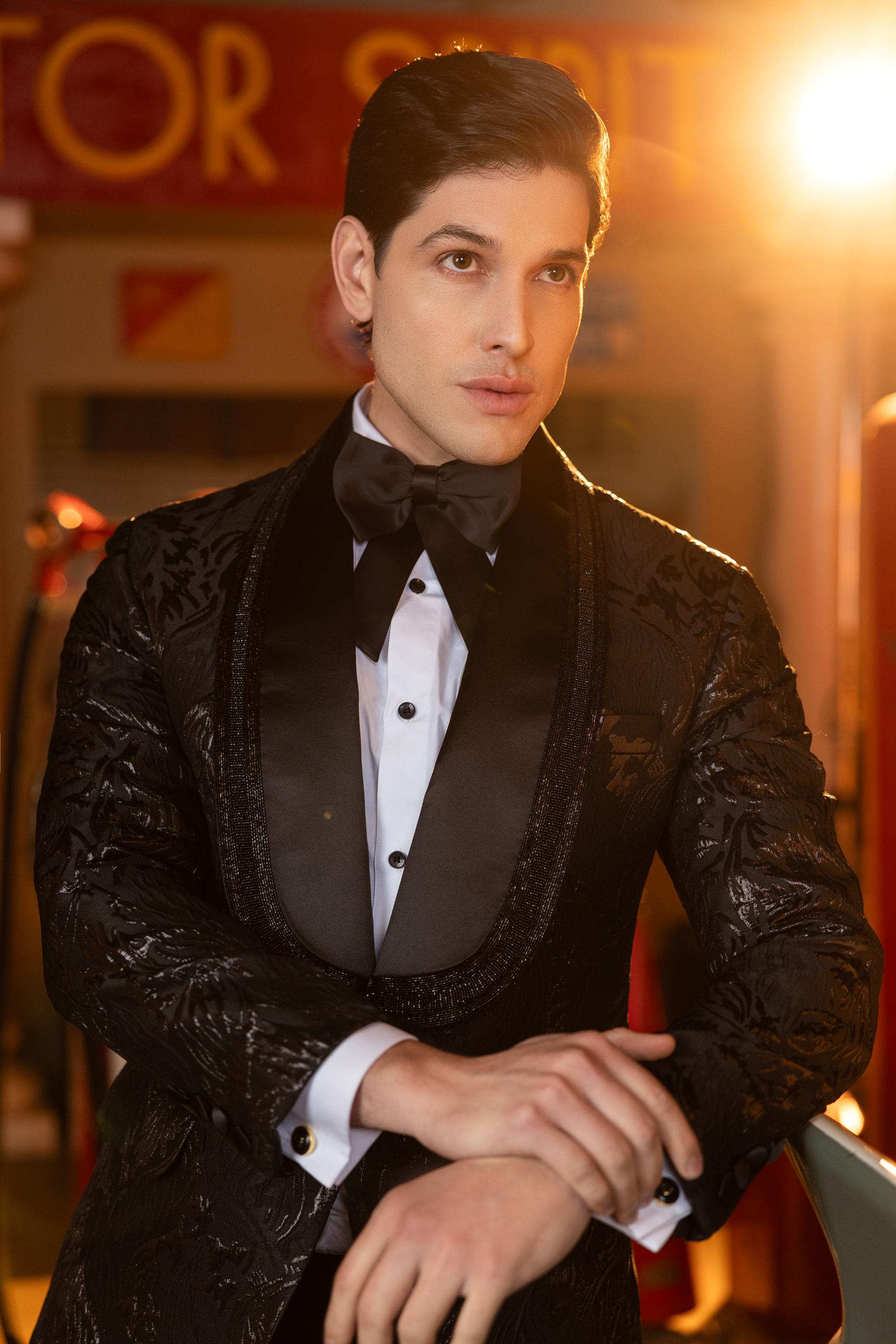 A masterpiece of artisanal craftsmanship and contemporary sophistication. This striking black tuxedo, tailored from luxurious tattered jacquard fabric, features an exquisitely hand-embroidered shawl lapel adorned with intricate cut-dana, moti, and nakshi detailing. Paired with impeccably tailored straight-fit trousers and a refined white diagonal pin-tucks shirt with elegant French cuffs, this ensemble exudes timeless grandeur. Designed for the modern connoisseur, Outfit is the epitome of luxury, making a bold statement at distinguished cocktail affairs.