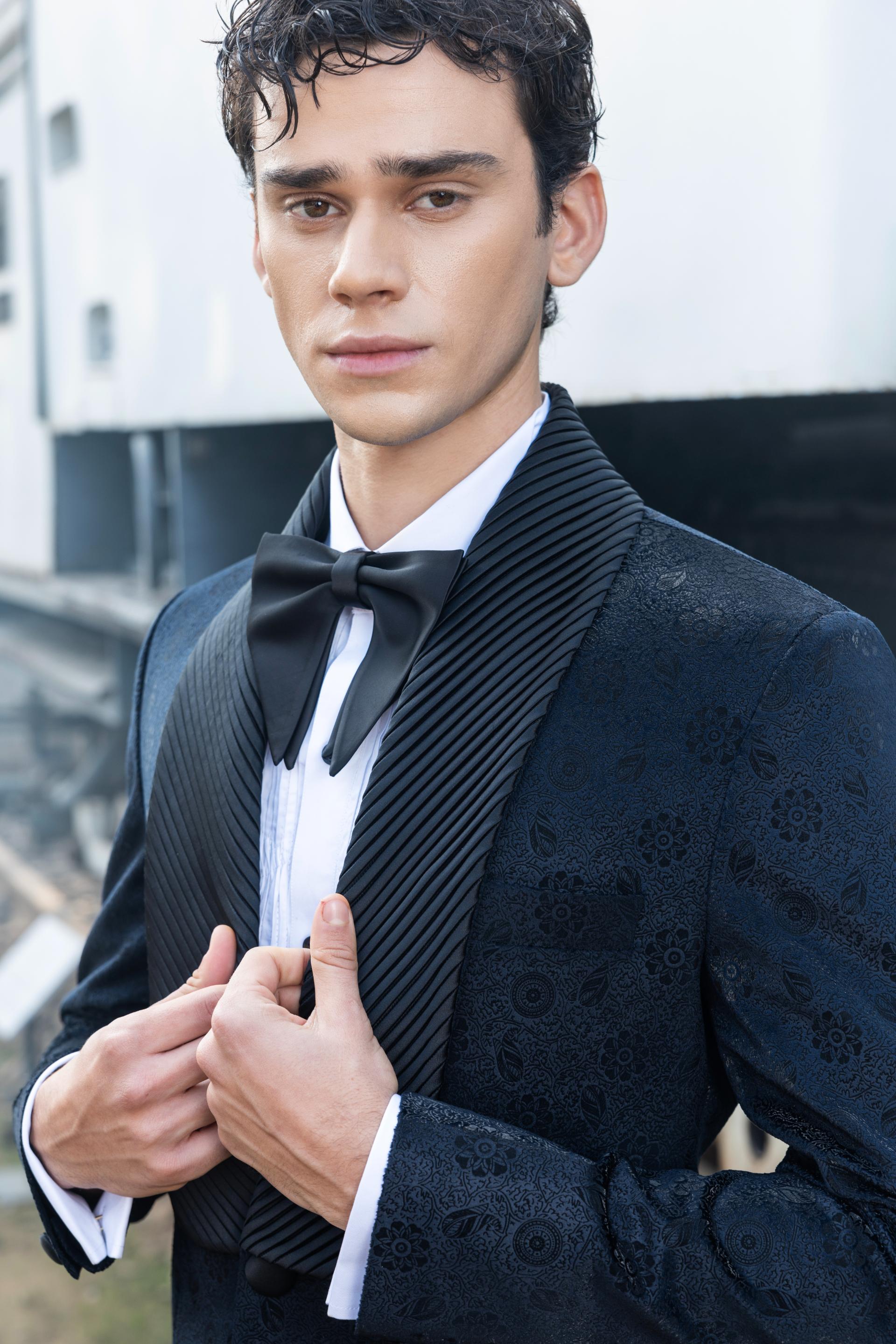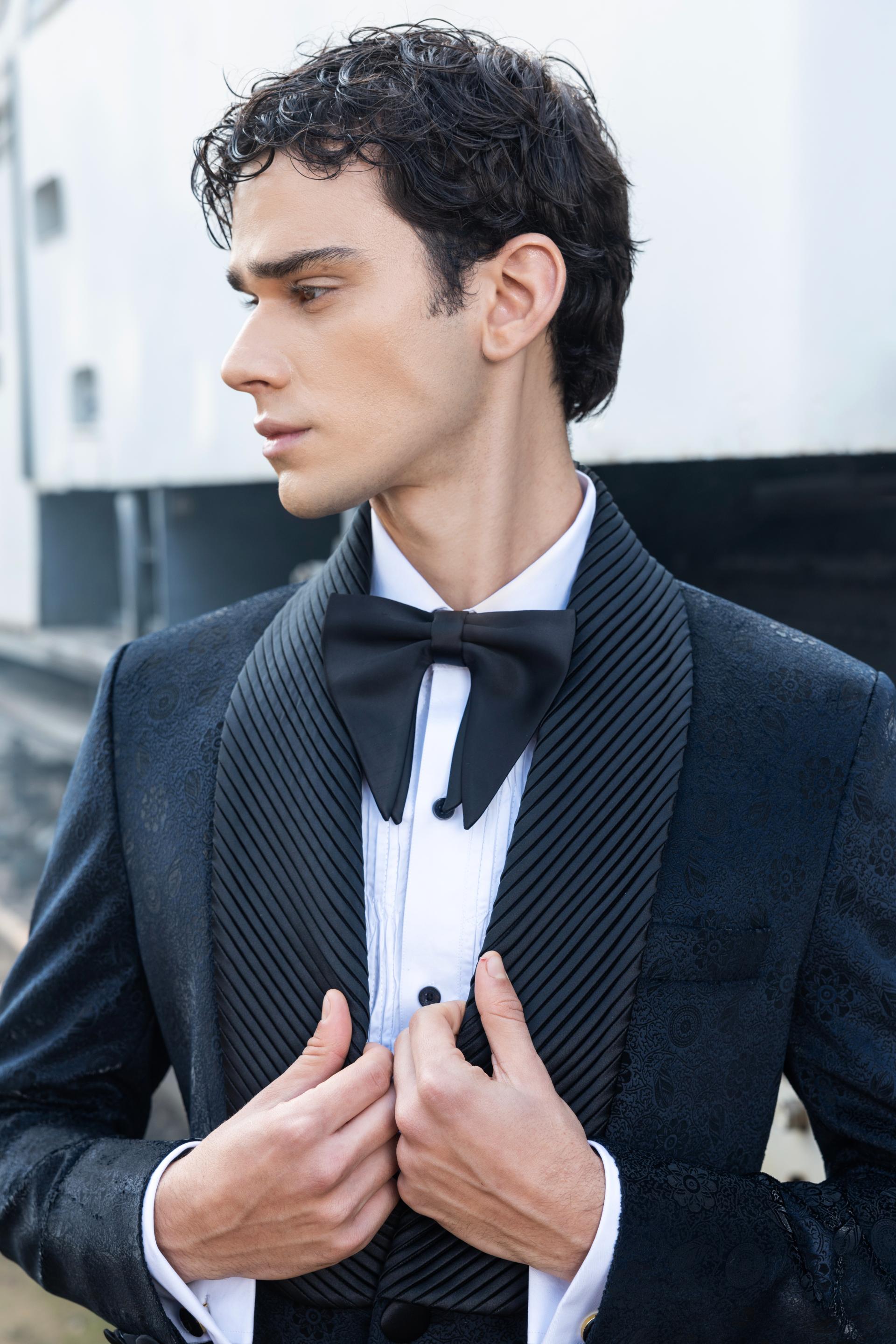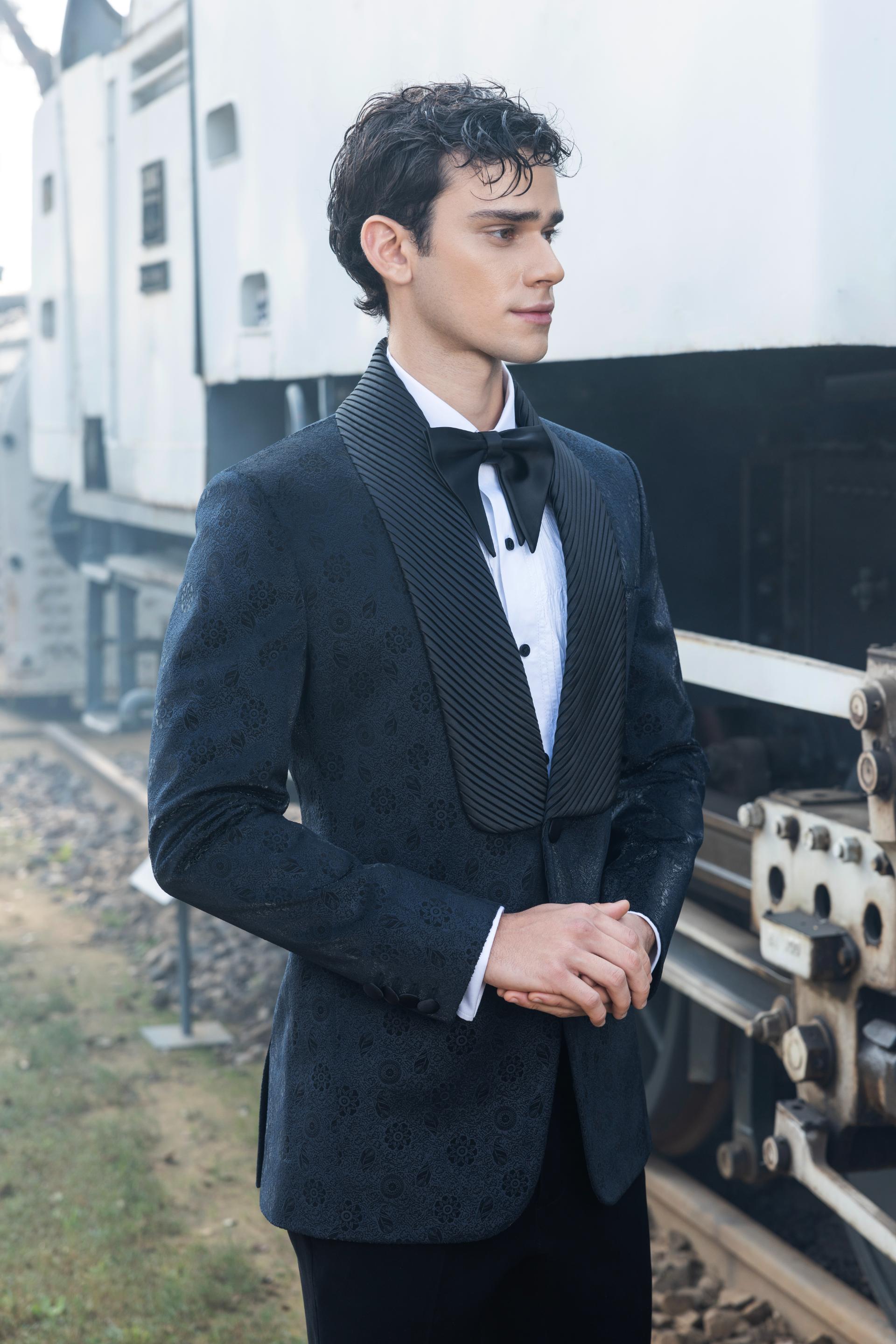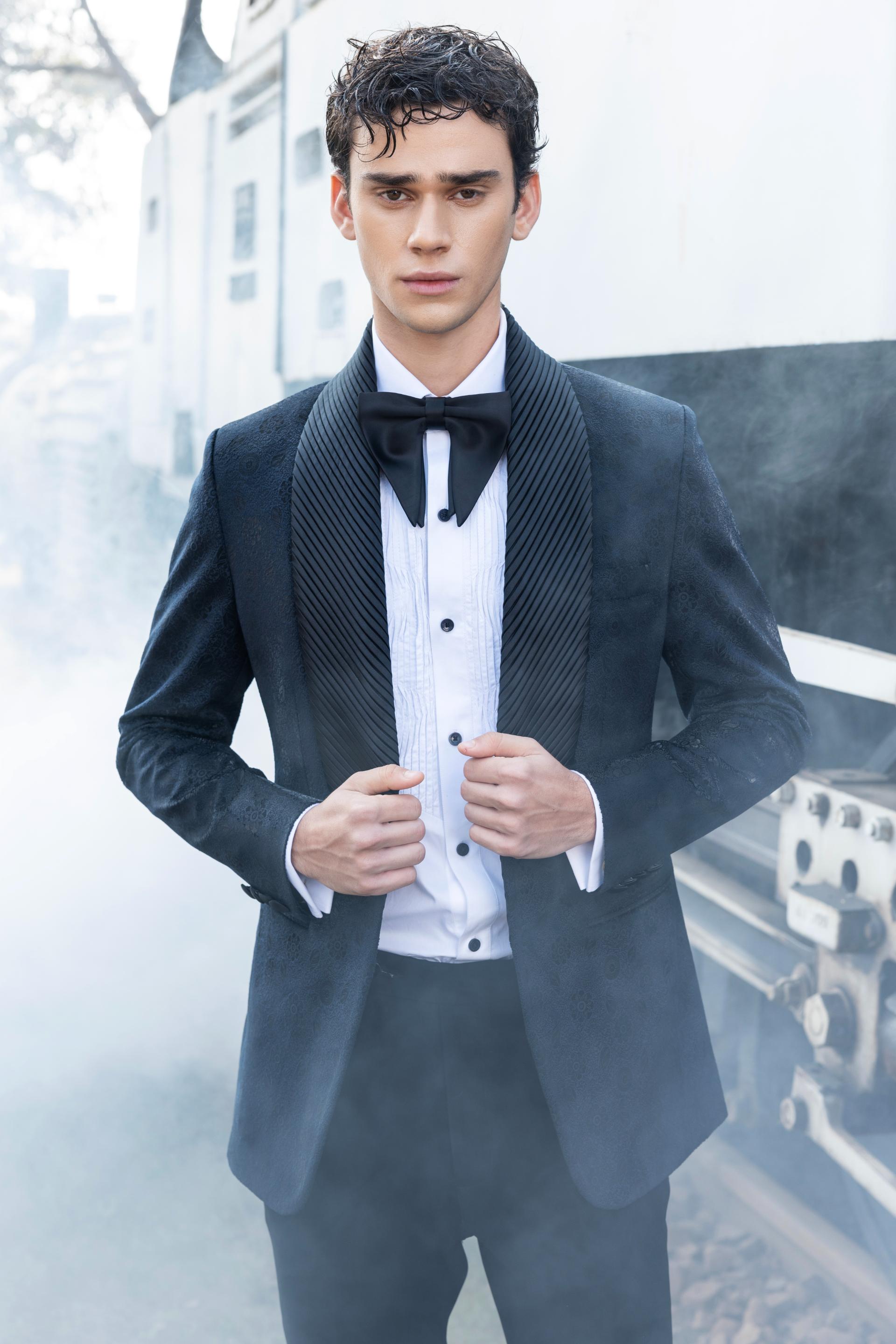 Step into the spotlight with a bold expression of luxury and innovation. The navy blue tuxedo, constructed from opulent burnout velvet, is distinguished by its graceful shawl-pleated lapel, while the wavy pin-tucks shirt adds an understated elegance. Tailored black trousers pair flawlessly with the shirt’s intricate French cuffs and double-cuffed sleeves for a polished, sophisticated look. Designed for the modern connoisseur, this refined set exudes an aura of distinction, making it a perfect choice for exclusive cocktail gatherings.