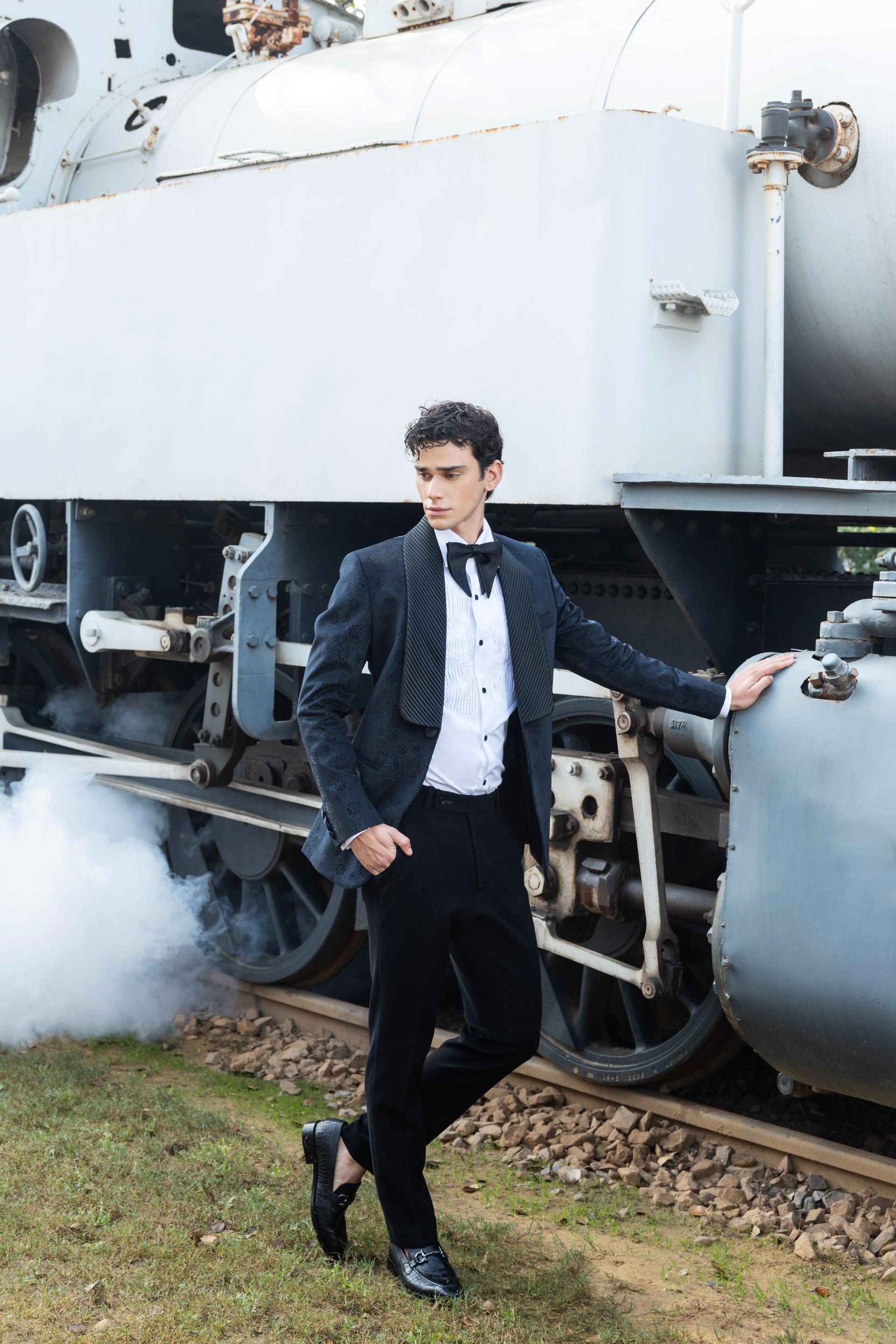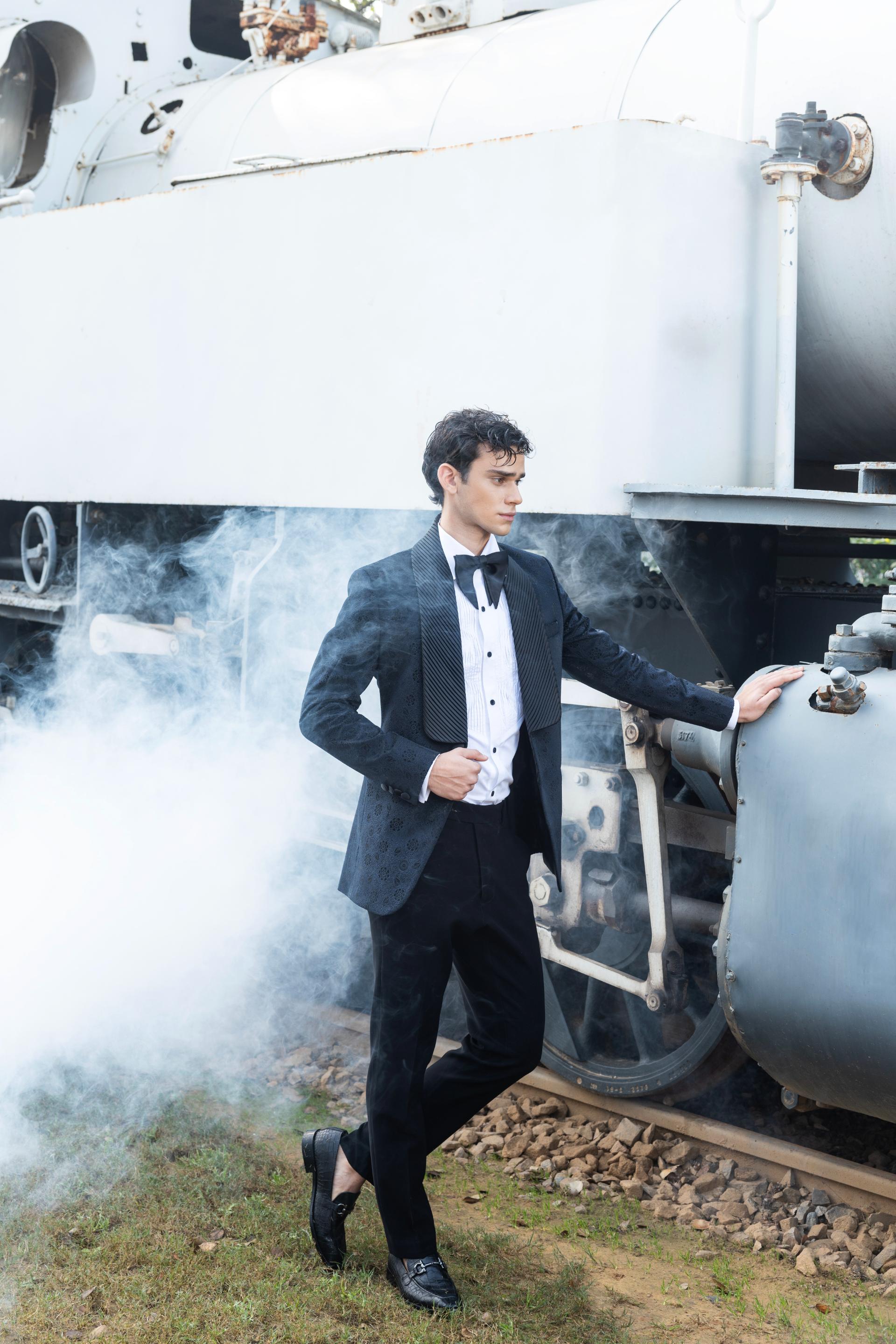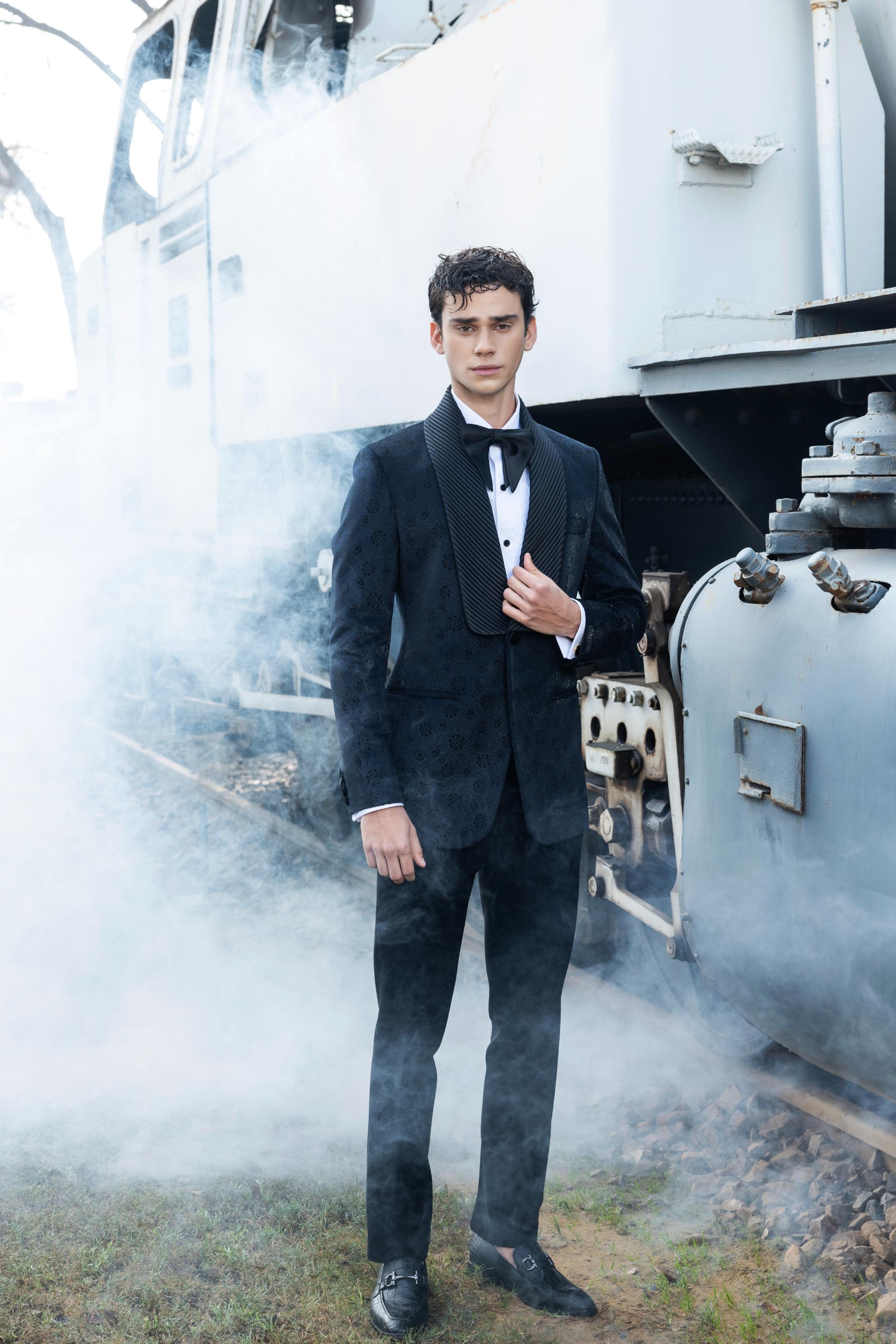 Components :- A designer tuxedo with straight fit trouser and pin-tucks shirt.