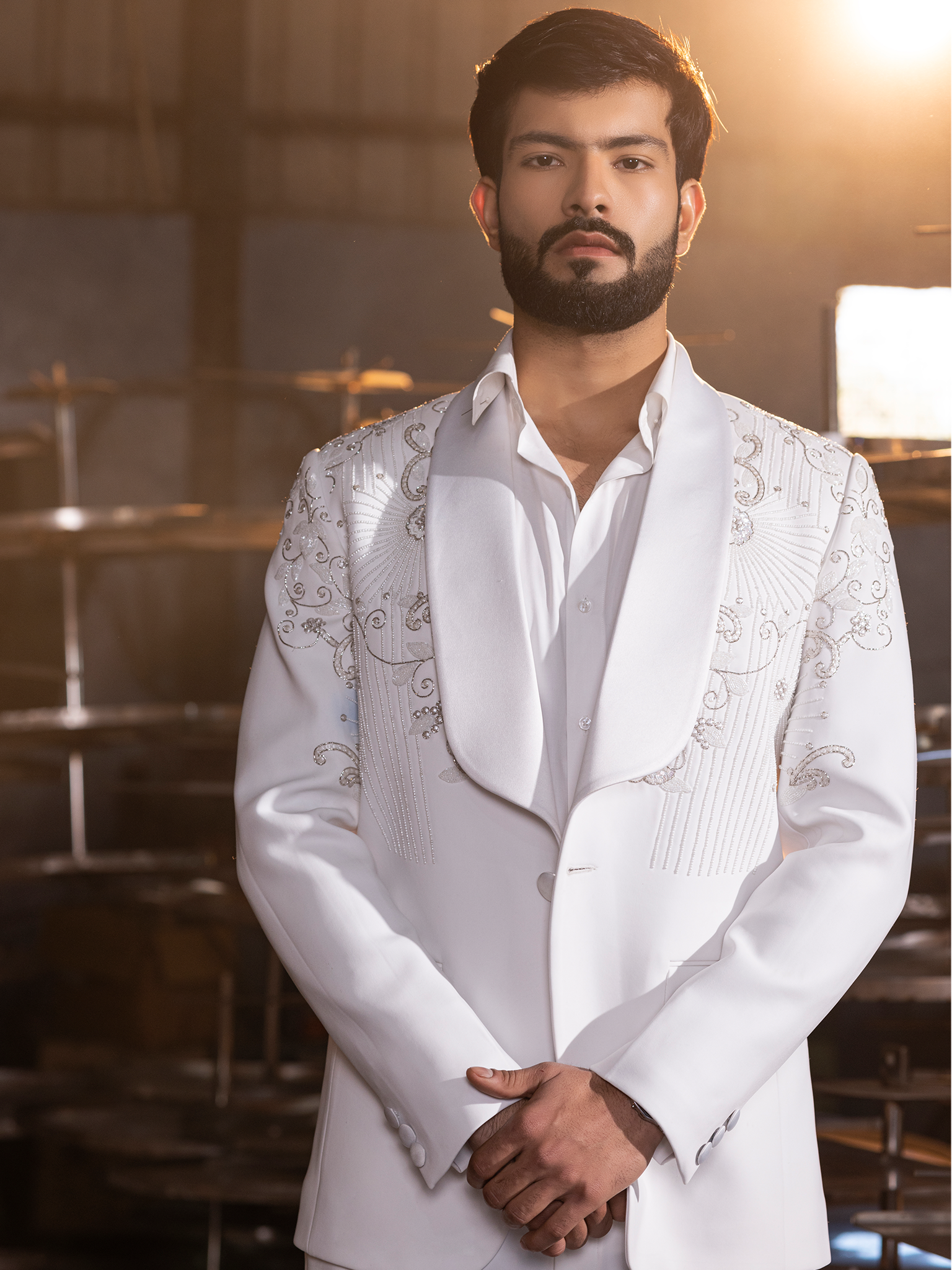 White Elegant Tuxedo, meticulously hand-embroidered in Lachka fabric. This timeless ensemble features a matching White Lachka Shirt and Pants, exuding a sense of refined sophistication. With its classic design and intricate details, this ensemble is sure to make a lasting impression at any blowout affair.